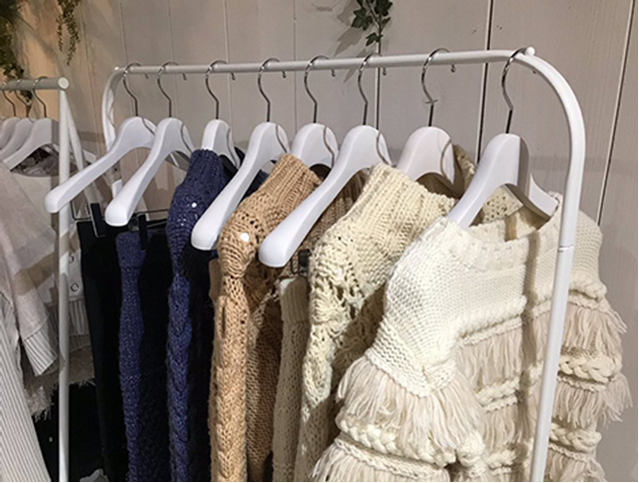 アイテムや魅せ方の用途によって、ハンガーの間隔を調整します。ハンガーの間隔を開けると、商品単体のアピールや高級感に繋がります。また、沢山掛けることによってサイズやカラーバリエーションを重視する場合もございます。